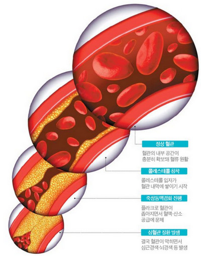 콜레스테롤은 지방 성분의 일종으로 우리 몸속의 세포막을 구성하거나 근육과 에너지원의 재료가 되기도 하고, 신경세포의 수초, 스테로이드 호르몬 및 담즙산의 원료가 되는 등 신체를 유지시키기 위해서 꼭 필요한 성분 중 하나입니다. 콜레스테롤은 간에서 생성되기도 하고 음식물을 통해 섭취되기도 하는데 우리 몸의 세포와 호르몬 생성에 반드시 필요한 물질이지만 필요이상으로 콜레스테롤이 많아지게 되면 동맥경화나 뇌졸중 등 심혈관계 질환이 유발되어 문제가 됩니다.