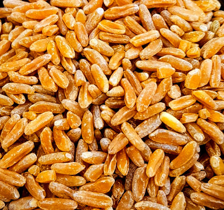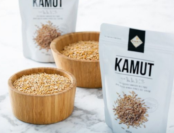 카무트는 벼과 밀속에 속한 작물로 원산지는 고대 이집트로 추측되고 있습니다. 최근에 카무트는 GI지수가 낮아 혈당을 천천히 올리는 당뇨에 좋은 쌀로 유명세를 타고 있는데요, 카무트의 원래 뜻은 '쌀보다 좋은 쌀' 이라는 뜻을 가진 상표명이라고 합니다. 카무트는 밀보다 알갱이가 3배 크고 황갈색을 띠며, 질감이 거칠어보이면서 맛은 견과류 맛이 납니다.