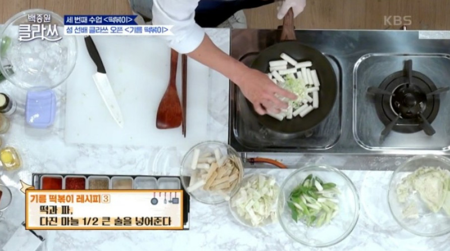 3. 프라이팬에 떡볶이 떡, 파, 다진 마늘 1/2 큰술을 넣어주세요.