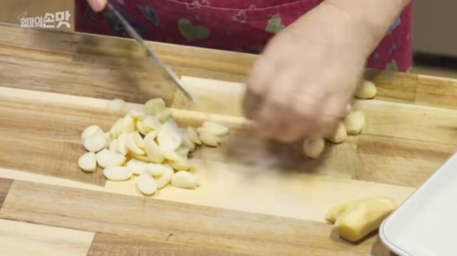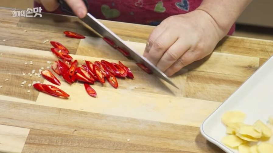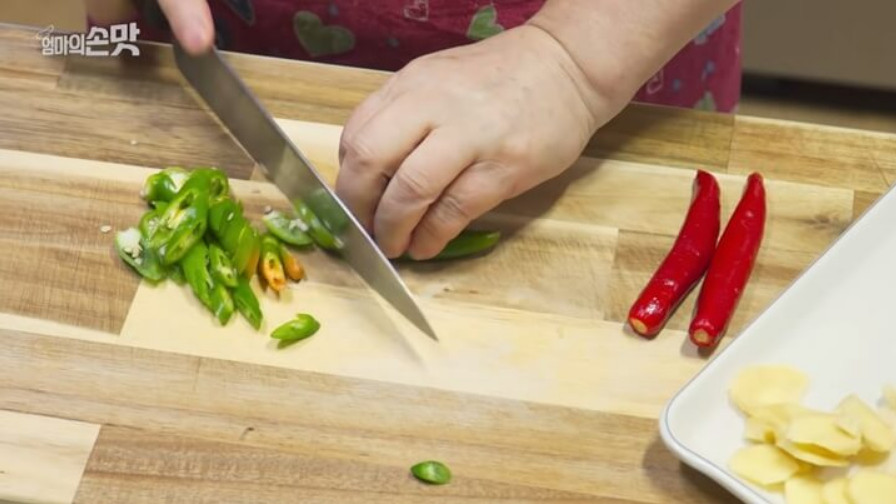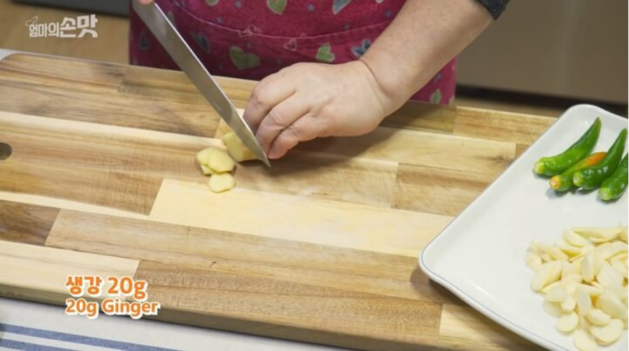 4. 다음은 부재료를 손질할 단계입니다. 통마늘 20개 정도를 편 썰어주시고 생강도 편 썰어서 준비해 주세요. 그리고 청양고추 4개와 홍고추 2개를 어슷 썰어서 씨를 살짝 털어주세요.