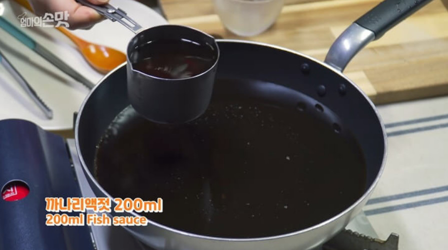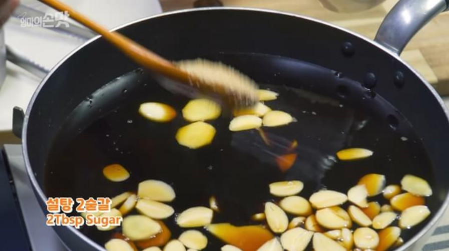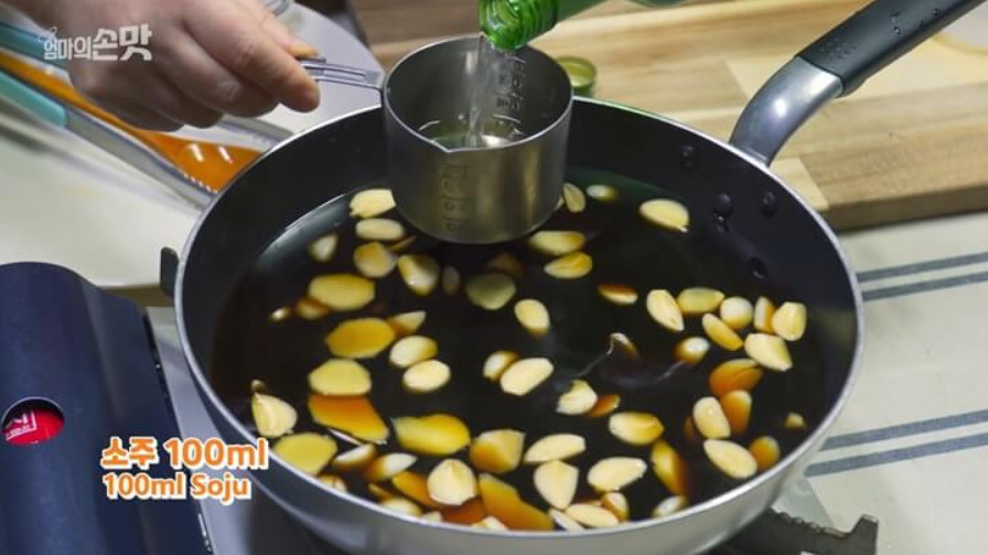 5. 이제 간장물을 만들 거예요. 아까 우려낸 육수에 진간장 또는 양조간장 300ml, 까나리 액젓 200ml, 손질한 생강과 마늘, 설탕 2큰술, 소주 100ml를 넣어주세요. 이렇게 간장과 까나리 액젓을 섞어서 넣으면 게장의 감칠맛이 살아난다고 해요. 간은 취향껏 맞추시면 되는데 만약 싱거운 것을 좋아하시면 간장과 액젓의 양을 조금 줄이시면 됩니다. 소주는 비린내와 잡내를 잡아준다고 해요. 간장물을 팔팔 끓인 후에는 간장물을 차갑게 식혀주세요.