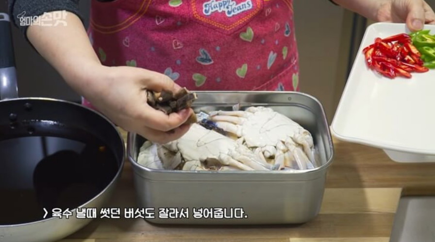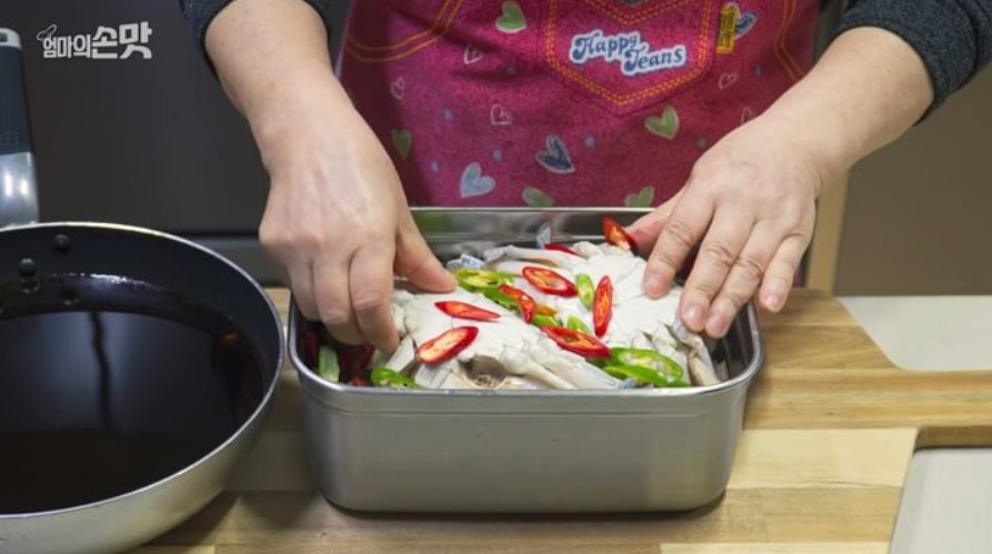 6. 간장물을 붓는 단계입니다. 밀폐용기에 게 다리를 먼저 바닥에 깔아주시고, 손질한 꽃게를 하나씩 차곡차곡 쌓아줍니다. 게를 넣을 때는 배가 위로 오게 넣어주세요. 그래야 간장물이 아래로 쑥 스며든다고 해요. 이때 아까 육수 낼 때 사용한 표고버섯을 채 썰어 꽃게 사이사이에 넣어주시면 좋아요. 청양고추와 홍고추도 올려줍니다.