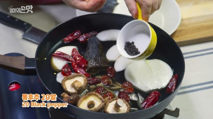 2. 다음은 육수 끓이기 단계입니다. 냄비에 물 1.8리터, 양파 큰 것 반 개, 배 반개, 건고추 5개, 북어대가리 1개, 밴댕이 10마리, 건표고버섯 4개, 감초 7개(혹은 황기), 대추 7개, 통후추 20알을 넣고 강불에서 15분간 끓인 후 약불로 줄여주세요.