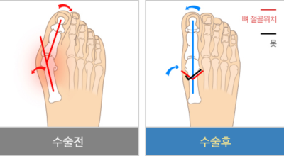 초기 단계에서는 건막류(두꺼운 혹)를 제거하는 건막류 절제술을 시행합니다. 이 수술은 돌출된 건막류를 제거하여 각도를 교정하고, 짧아진 근육이나 연부조직을 늘려주는 비교적 간단한 수술입니다. 만약 다른 발가락의 변형이 함께 있거나 뼈의 과잉 성장이 심한 경우, 뼈를 깎아 방향을 수정하고 발가락을 똑바로 펴기 위해 철사로 고정하는 교정 절골술을 시행합니다. 양쪽 발이 모두 변형된 경우 대부분 한쪽씩 나누어 수술을 진행합니다.