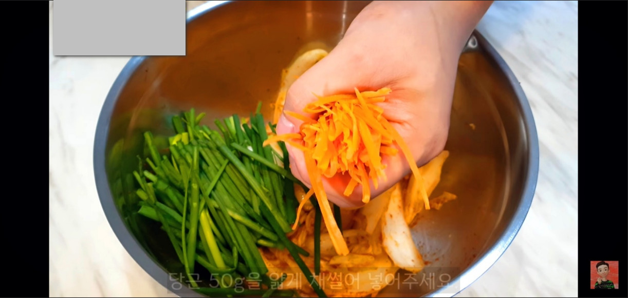 배추겉절이 만드는 과정이 거의 끝났어요. 손가락 길이로 자른 실파 한 줌과 당근 한 줌을 넣으면, 배추겉절이가 더 예쁘고 먹음직스러워집니다.