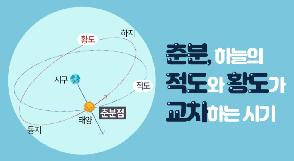 한자어로 봄을 나눈다는 의미를 가진 춘분은 24절기 중 4번째 절기로, 경칩(驚蟄)과 청명(淸明)의 중간에 해당합니다. 양력으로는 3월 21일 전후, 음력으로는 2월 무렵에 해당합니다. 천문학적으로는 태양이 남반구에서 북반구로 향하며 적도를 통과하는 시점을 의미하는데, 이때 황도(黃道)와 적도(赤道)가 교차하는 지점인 춘분점(春分點)에 도달합니다. 이 시점에서는 태양의 중심이 적도 위를 정확히 비추며, 양(陽)은 정동(正東)에, 음(陰)은 정서(正西)에 위치하는 시기입니다.