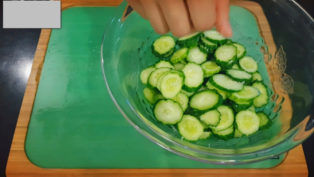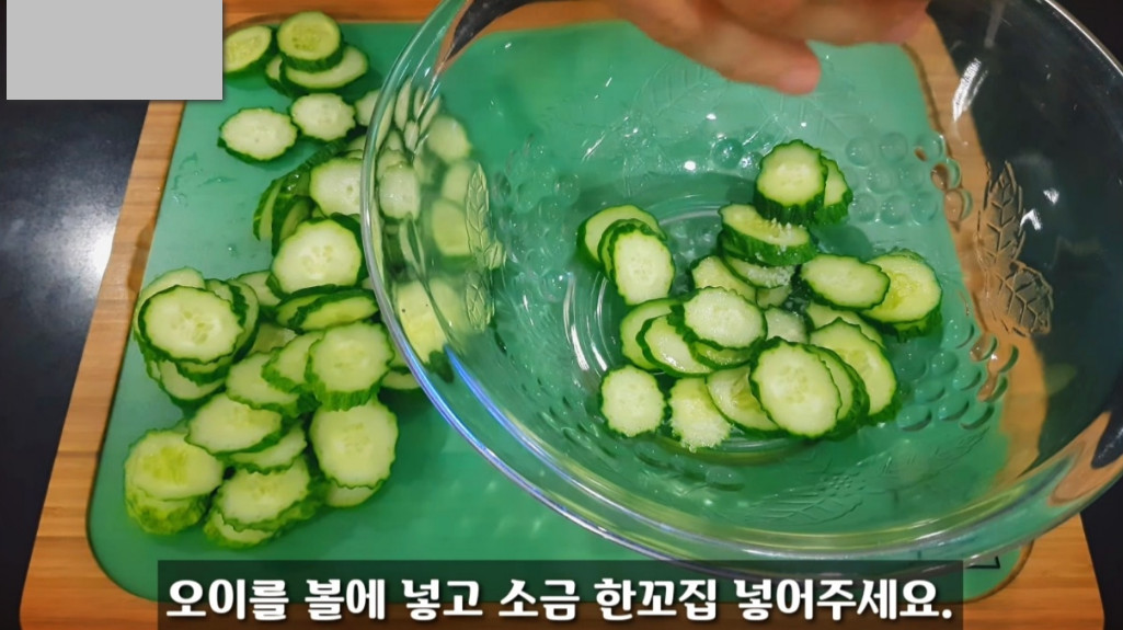 잘라둔 오이를 그릇에 담고 소금 반 스푼을 넣어 골고루 버무려주세요. 오이가 절여지면서 간이 배는 동안 다른 재료들을 준비하시면 됩니다.
