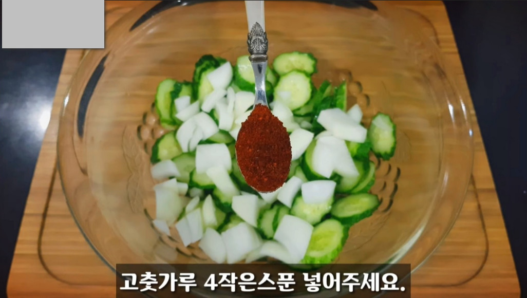 절여둔 오이의 물기를 따라 버린 뒤, 썰어둔 양파와 고춧가루 4스푼을 넣어 칼칼한 맛을 더해줍니다.