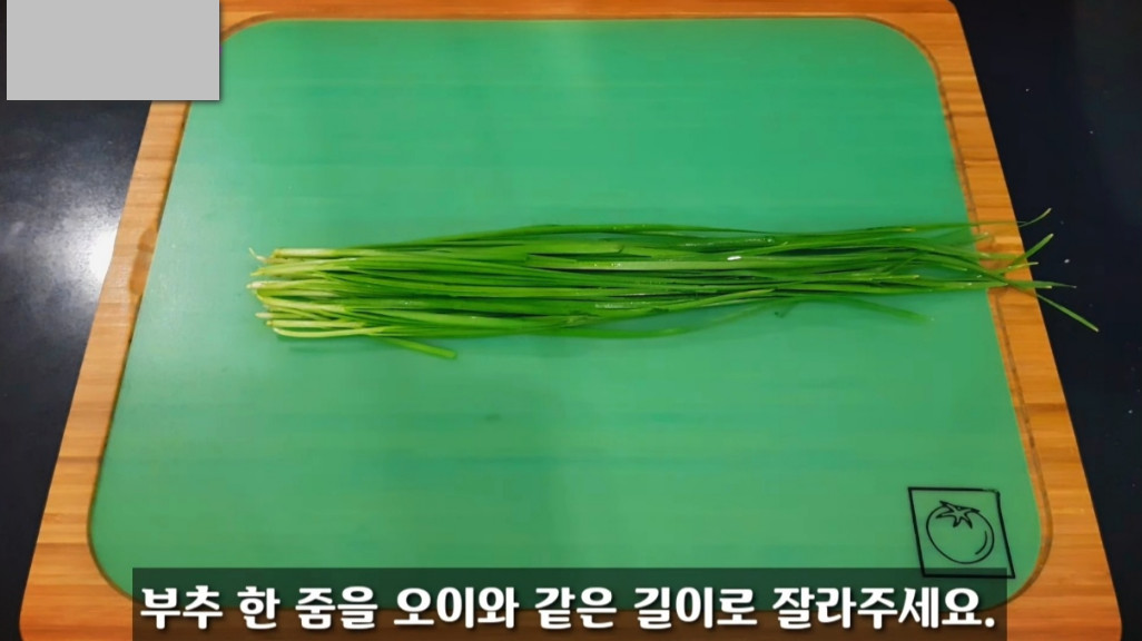 싱싱한 부추 한 줌을 준비한 뒤, 오이와 비슷한 크기로 잘라주시면 됩니다. 너무 작게 자르면 잘 집히지 않고, 너무 크면 오이무침이 지저분해 보일 수 있으니 오이 크기와 비슷하게 썰어주는 게 가장 좋습니다!
