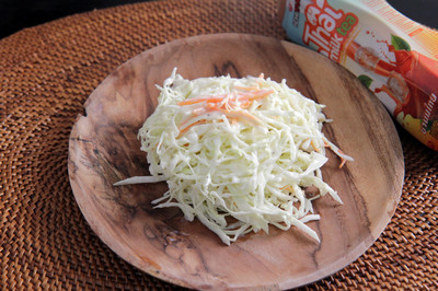 양배추 샐러드는 양배추 100g과 당근을 최대한 얇게 채 썬 후 접시에 담고 샐러드 소스를 뿌려 섞어주면 완성입니다. 당근 이외에도 다른 과일이나 야채를 넣어도 무방합니다.