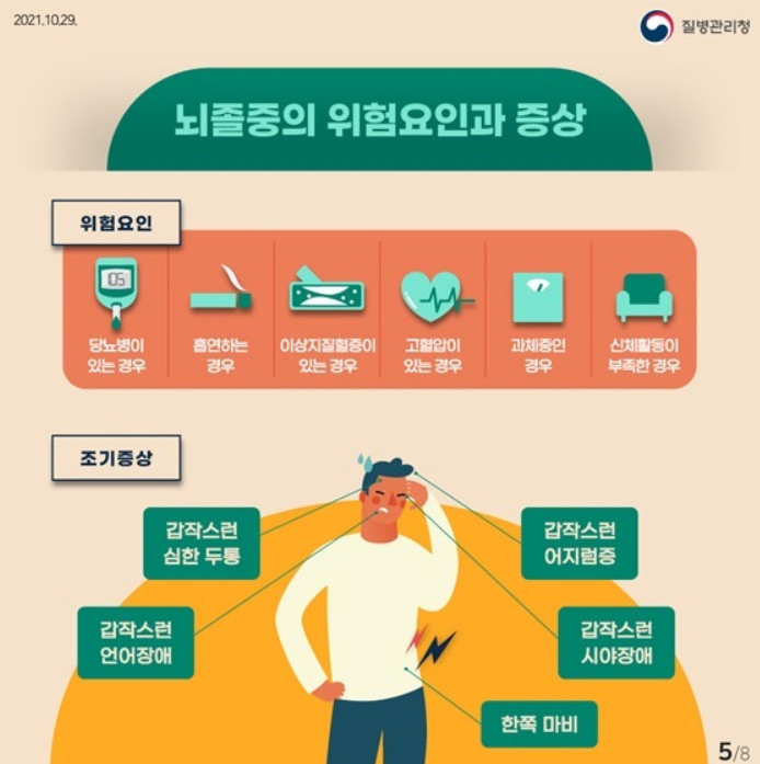 뇌졸중 전조증상 원인 대처방법을 살펴보겠습니다. 뇌졸중은 국내 3대 사망원인이자 단일 질환으로는 사망률 1위를 기록하는 무서운 병입니다. 기저질환(심장질환, 고혈압, 당뇨, 고지혈증, 동맥경화증 등)이나 흡연, 비만, 가족력 등 생활습관 요인이 있다면 발생 확률이 높아지게 되며 뇌의 어느 부위에 이상이 생겼느냐에 따라 초기 증상이 여러 가지 양상으로 나타납니다. 뇌졸중 전조증상 원인 및 대처방법에 대해서 좀 더 자세히 살펴보도록 하겠습니다.