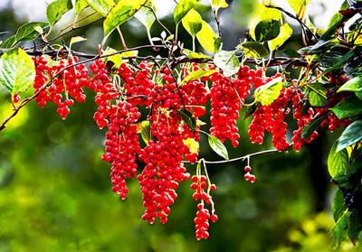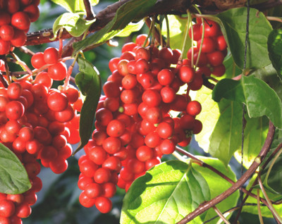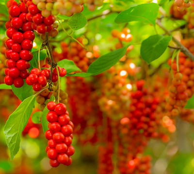 오미자는 낙엽 넝쿨성의 다년생 목련과 식물로 6,7월경에 홍백색의 향기로운 꽃이 피고 과실은 8,9월에 붉게 익습니다. 주로 동북아 일대에서 자생하며 우리나라의 경우 북부와 중부의 산기슭이나 골짜기의 나무숲에서 자랍니다. 이름에서 알 수 있듯 오미자(五味子)는 시고(酸) 쓰고(苦) 맵고(辛) 짜고(鹹) 단(甘) 맛의 5가지 맛이 나는데 그중에서 신맛이 가장 강하게 나며 이는 풍부한 유기산을 함유하고 있기 때문입니다. 우리나라 <동의보감(東醫寶鑑)>에서는 오미자가 가쁜 숨을 바로 잡고 피를 맑게 하며 식은땀과 갈증을 해소해주며, 콩팥을 보호하고 오장을 튼튼하게 하는 효능이 있다고 기술되어 있습니다.