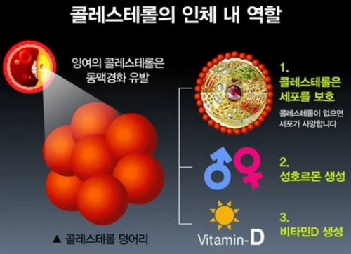 콜레스테롤은 지방 성분의 일종으로 우리 몸속의 세포막을 구성하거나 근육과 에너지원의 재료가 되기도 하고, 신경세포의 수초, 스테로이드 호르몬 및 담즙산의 원료가 되는 등 신체를 유지시키기 위해서 꼭 필요한 성분 중 하나입니다. 콜레스테롤은 간에서 생성되기도 하고 음식물을 통해 섭취되기도 하는데 우리 몸의 세포와 호르몬 생성에 반드시 필요한 물질이지만 필요이상으로 콜레스테롤이 많아지게 되면 동맥경화나 뇌졸중 등 심혈관계 질환이 유발되어 문제가 됩니다.