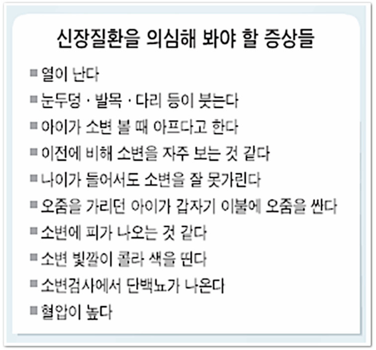 하지만 신장이 안좋다는 것을 몸으로 느끼게 되는 경우는 이미 신장이 망가져 상태가 악화된 경우가 대부분이므로 뒤늦게 병원을 찾아 치료 기회를 놓치는 경우가 많다고 합니다. 그럼 신장이 안좋으면 나타나는 증상에 대해서 알아보겠습니다.