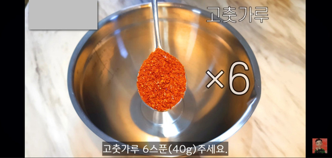 이제 배추겉절이 양념장을 만들 차례예요. 굵은 고추가루 6스푼과 갈아둔 채수를 넣어 주세요.
