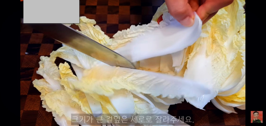 안쪽의 작은 배추는 그대로 두시고, 바깥쪽의 큰 배추잎들은 배추 결을 따라 길게 드시기 좋은 크기로 잘라주세요.