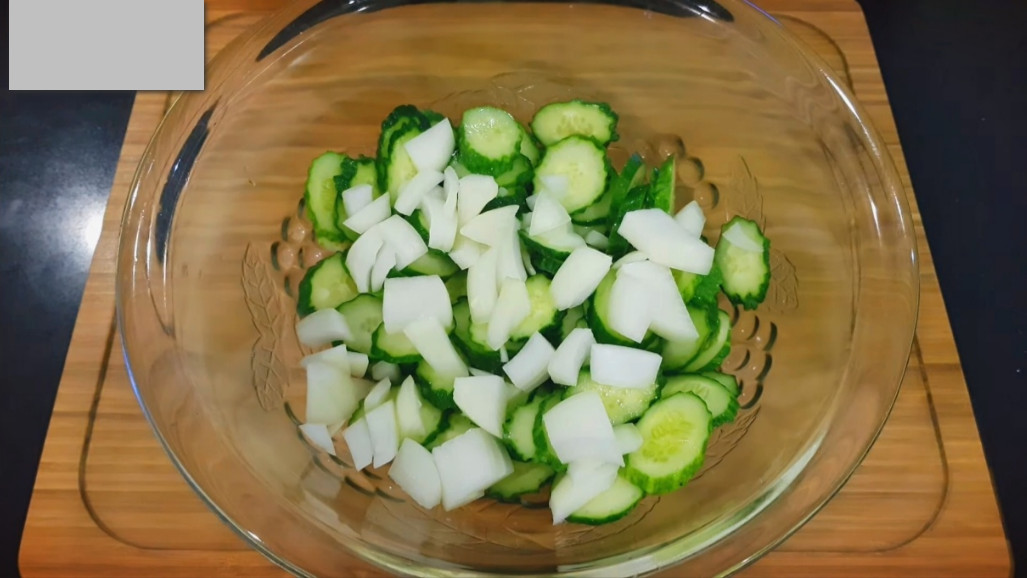 잘라둔 오이를 그릇에 담고 소금 반 스푼을 넣어 골고루 버무려주세요. 오이가 절여지면서 간이 배는 동안 다른 재료들을 준비하시면 됩니다.