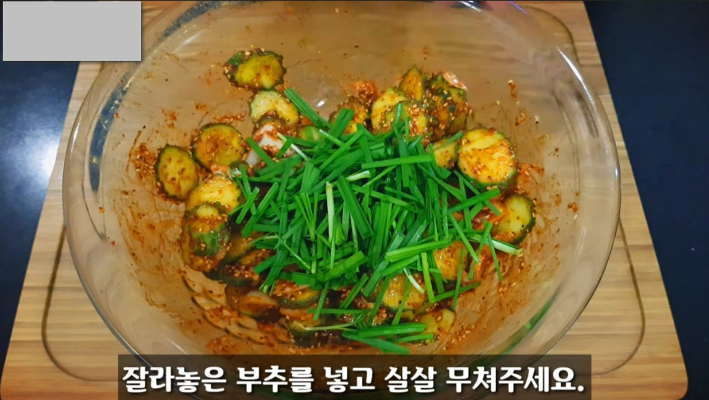 오이무침 황금레시피의 꿀팁입니다. 부추는 처음부터 넣지 말고 나중에 넣어서 살살 무쳐주세요. 처음부터 넣거나 너무 세게 버무리면 부추가 망가지면서 쿰쿰한 향이 나서 맛이 떨어질 수 있습니다.