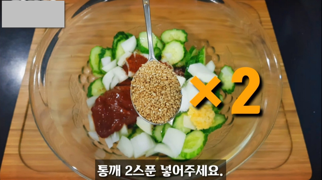 설탕 한 스푼과 참기름 반 스푼을 넣으면 은은한 단맛과 함께 고소한 풍미가 어우러진 오이무침을 즐기실 수 있습니다!