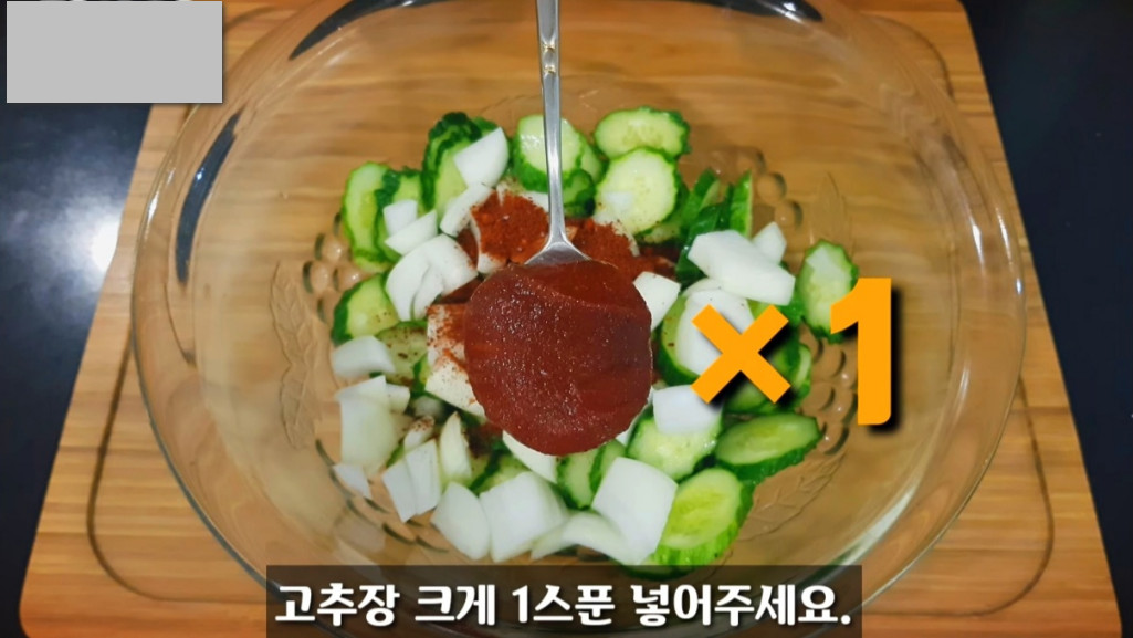 절여둔 오이의 물기를 따라 버린 뒤, 썰어둔 양파와 고춧가루 4스푼을 넣어 칼칼한 맛을 더해줍니다.