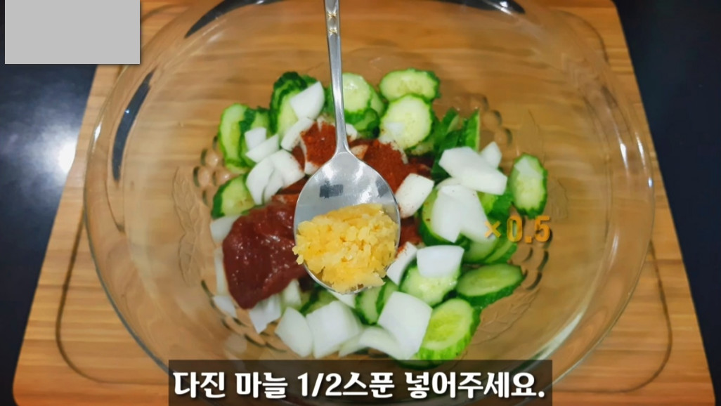 고추장 크게 한 스푼과 다진 마늘 반 스푼을 넣어 매콤한 맛과 알싸한 마늘 향을 오이무침에 더해줍니다.
