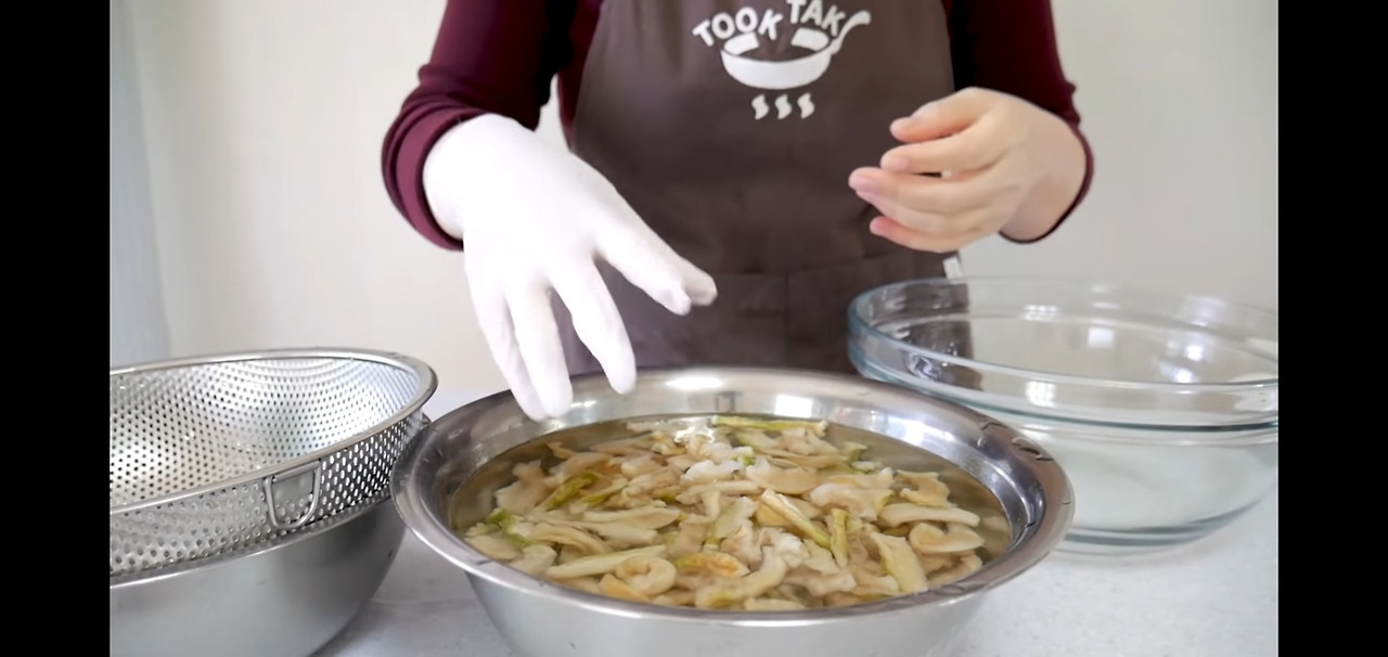 말린 무 400g은 찬물에 40분 정도 담가둔 후 채에 받쳐 물기를 제거해주면 됩니다. 이렇게 준비하면 무말랭이무침 황금레시피의 재료 손질이 완료됩니다!