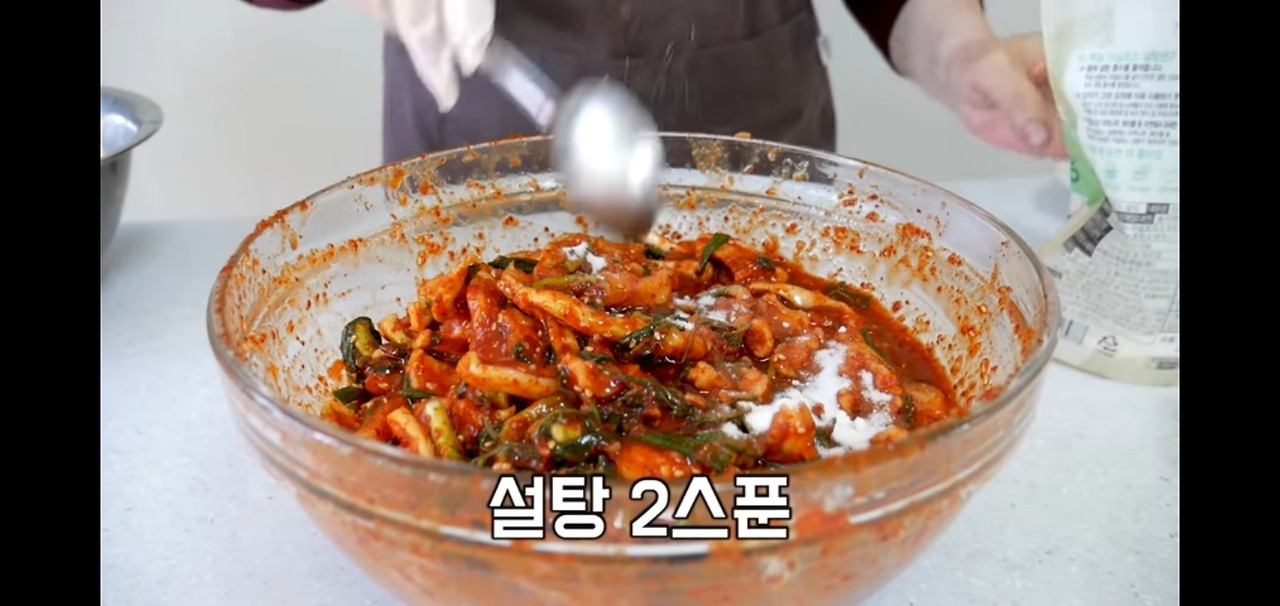 고추가루 10스푼을 넣어 칼칼하고 매콤한 맛을 더해주시고, 찹쌀풀 5스푼도 함께 넣어주시면 양념이 적당히 끈끈해져서 무말랭이무침에 잘 어울립니다.