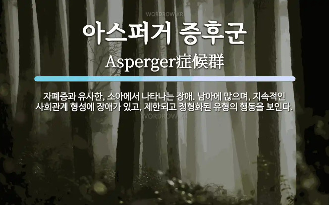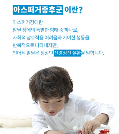 아스퍼거 증후군이란 지적 능력은 거의 정상이지만 사회적 관계형성능력에 문제가 있으며 특정한 것에 과도한 집착을 보이는 전반적인 발달장애를 말합니다. 여기서 발달장애란 선천적 또는 발육과정 중에 생긴 대뇌의 손상으로 인하여 지능 및 운동 발달장애, 시각, 언어 발달장애, 청각 등의 특수감각 기능장애, 기타 학습장애 등이 발생한 것을 일컫습니다. 발달장애는 보통 선천적인 대뇌발달 이상을 비롯하여 환경적 요인, 생물학적 요인 등에 의하여 발생하는 것으로 알려져 있으며, 또래 아이들보다 25% 이상 성장이 늦은 경우가 이에 해당합니다. 이 중에서 전반적 발달장애(여러 가지 기능저하가 복합적으로 나타나는 경우)에 대표적으로 아스퍼거 증후군과 자폐증이 있습니다.