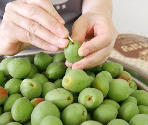 ② 이쑤시개를 이용해 매실 꼭지를 깔끔하게 제거해주고, 이쑤시개로 과육의 2~3군데를 찔러줍니다.